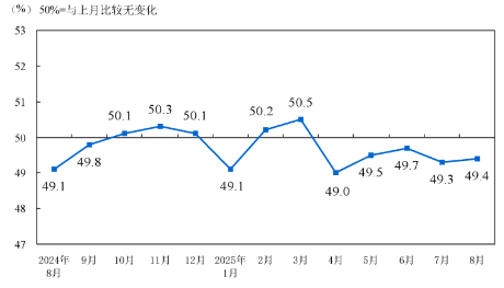 8月官方制造业PMI为49.4%8月份,制造业采购经理指数、非制造业商务活动指数和综合PMI产出指数分别为49.4%、50.3%和50.5%,比上月上升0.1、0.2和0.3个百分点,三大指数均有所回升,我国经济景气水平总体继续保持扩张。