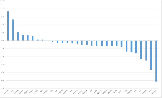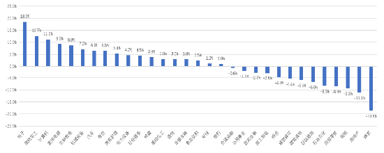 申万一级行业中,本周涨跌幅前五的行业为电力设备、综合、有色金属、医药生物、纺织服饰,涨幅分别为7.39%、5.38%、2.12%、1.40%、1.37%。